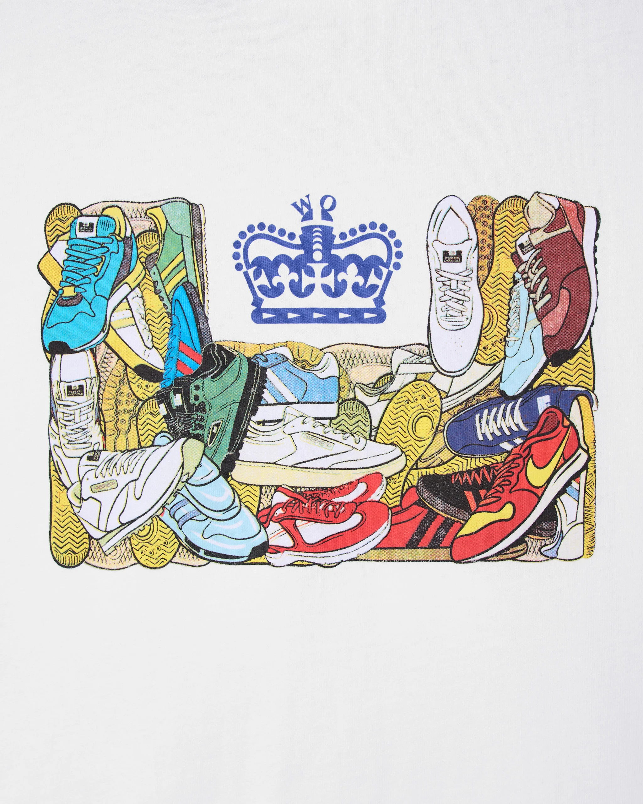 Le t-shirt graphique D'Arblay arbore un empilement de baskets classiques formant le logo WEEKEND OFFENDER. Un hommage aux semelles qui ont façonné une sous-culture.