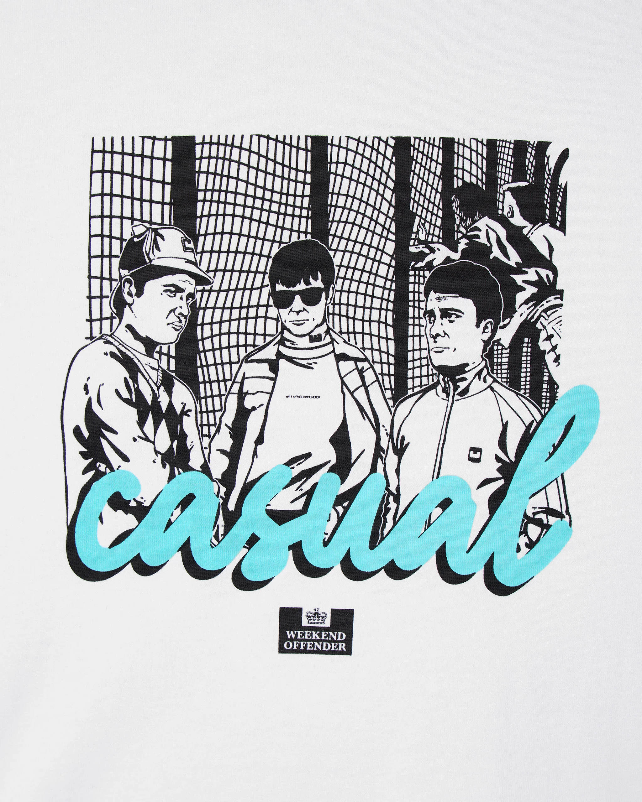 Le t-shirt graphique Terrace présente une illustration saisissante de la culture des tribunes britanniques des années 1980. On y voit un groupe de supporters en tenues sportswear classiques, devant un stade de football.