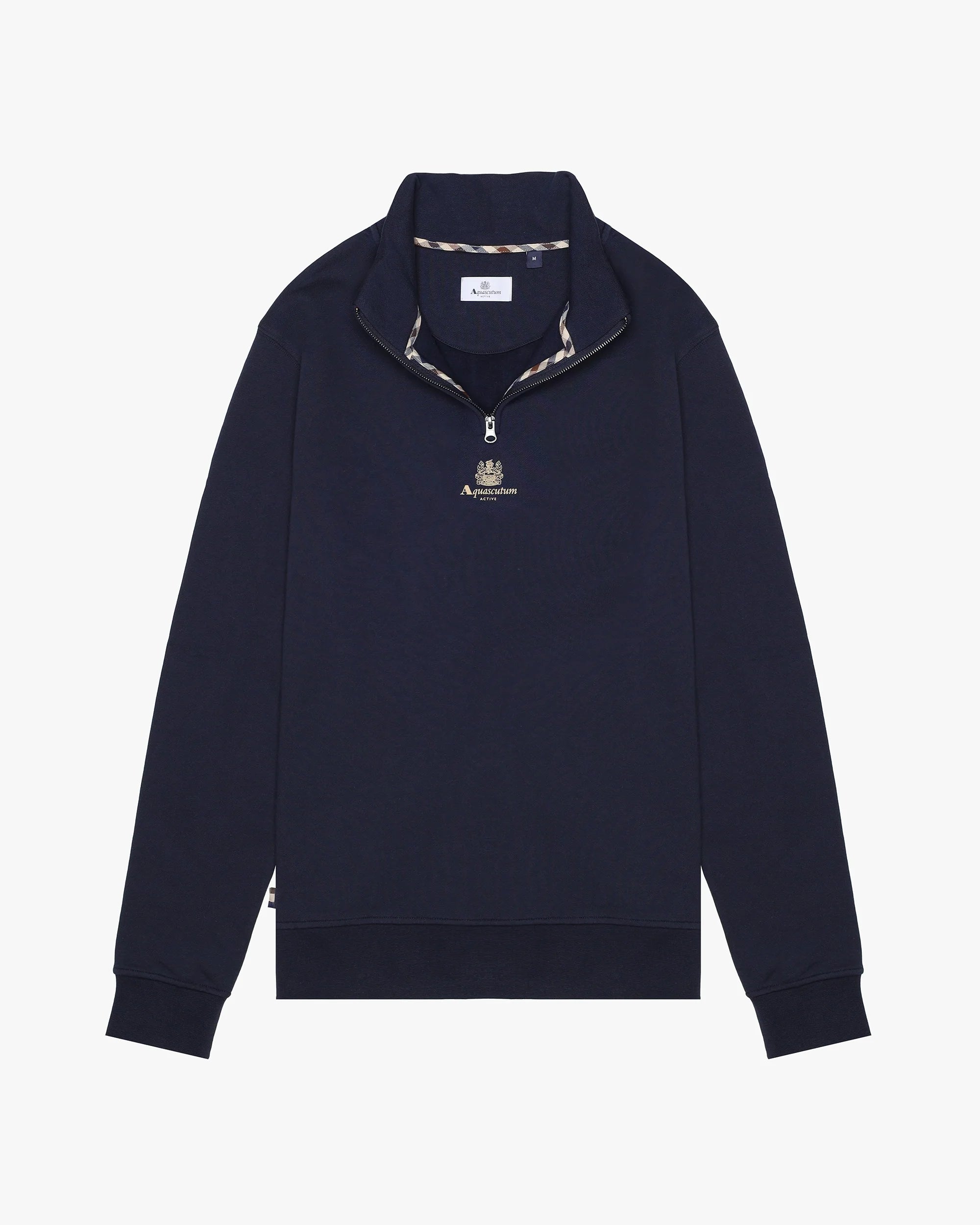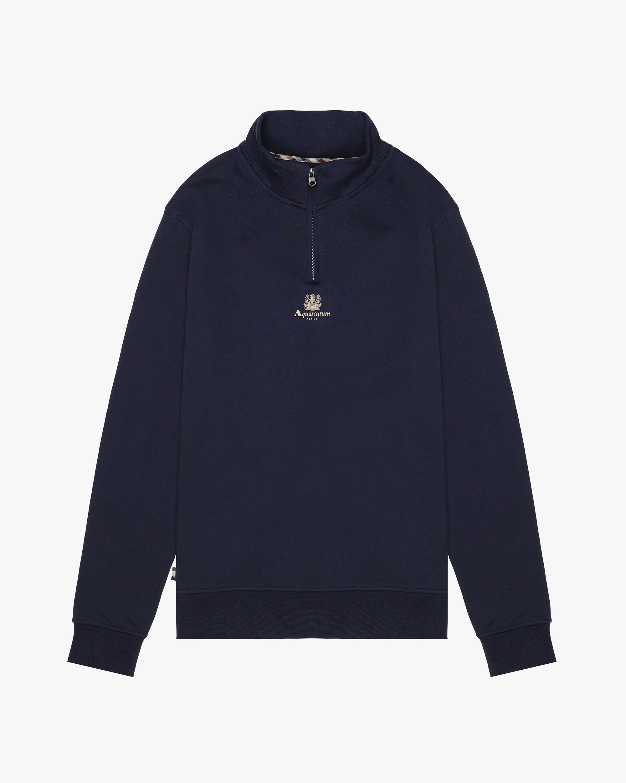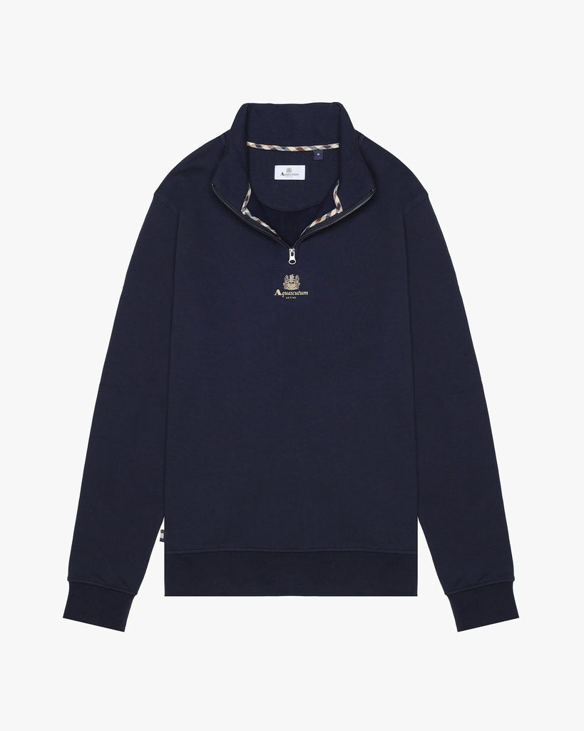 Une polaire propre et polyvalente avec une touche fonctionnelle élevée. Ce sweat-shirt en coton brossé présente un mockneck avec une fermeture éclair YKK d'un quart de longueur et un logo Aquascutum Active placé au centre avec Crest historique. Un essentiel moderne qui relie le sport et la sophistication.