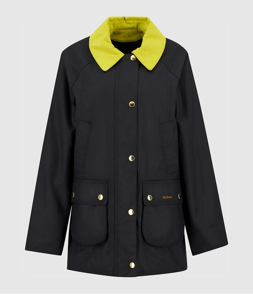 Veste en coton ciré noire mi-longue avec col en velours côtelé jaune. Fermeture par zip et boutons avec 2 poches plaquées à l'avant. Ouverture en bas par boutons sur les côtés.