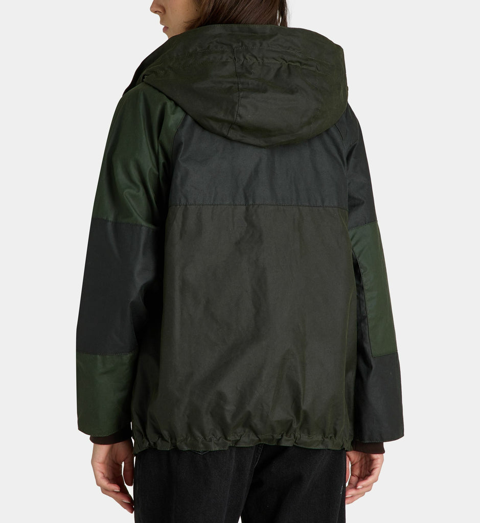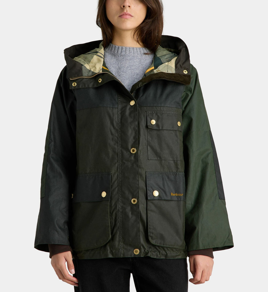 Cette veste droite Barbour en coton ciré présente un col montant. Elle est munie d’une capuche, d’une fermeture à boutons pression ainsi que de poches sur le devant et la poitrine.